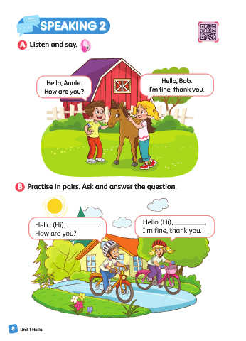 SPEAKING 2 SPEAKING 2 A Listen and say. Hello, Annie. Hello, Bob. How are you? I’m fine, thank you. B Practise in pairs. Ask and answer the question. Hello (Hi), . Hello (Hi), . How are you? I’m f ine, thank you. 8 Unit 1 Hello!