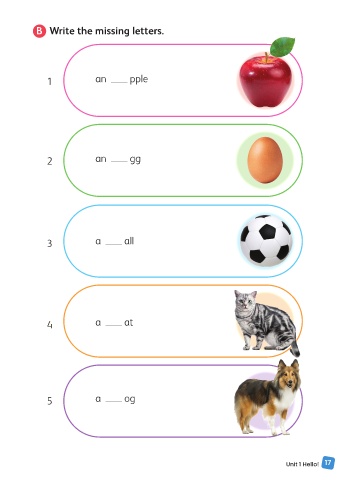 B Write the missing letters. 1 an pple 2 an gg 3 a all 4 a at 5 a og Unit 1 Hello! 17