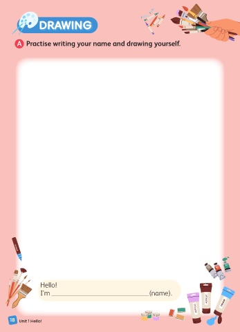 DRA WING DRAWING A Practise writing your name and drawing yourself. COLOUR COLOUR COLOUR Hello! COLOUR I’m (name). COLOUR COLOUR COLOUR 18 Unit 1 Hello! COLOUR