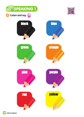 SPEAKING 1 SPEAKING 1 A Listen and say. black blue green orange pink purple red yellow 24 Unit 2 Colours