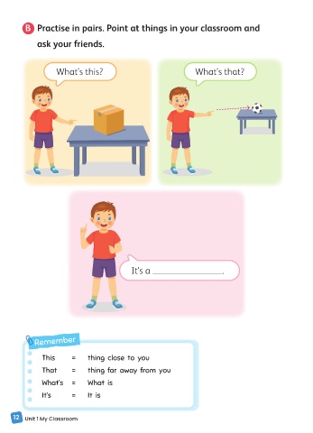 B Practise in pairs. Point at things in your classroom and ask your friends. What’s this? What’s that? It’s a . Remember This = thing close to you That = thing far away from you What’s = What is It’s = It is 12 Unit 1 My Classroom