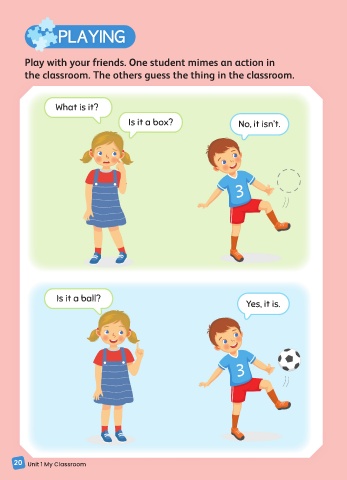 PLAYING PLAYING Play with your friends. One student mimes an action in the classroom. The others guess the thing in the classroom. What is it? Is it a box? No, it isn’t. Is it a ball? Yes, it is. 20 Unit 1 My Classroom