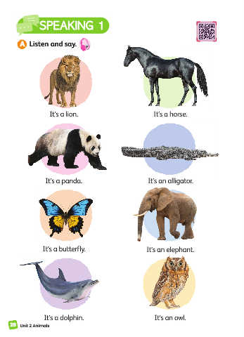 SPEAKING 1 SPEAKING 1 A Listen and say. It’s a lion. It’s a horse. It’s a panda. It’s an alligator. It’s a butterf ly. It’s an elephant. It’s a dolphin. It’s an owl. 26 Unit 2 Animals