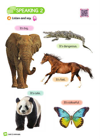 SPEAKING 2 SPEAKING 2 A Listen and say. It’s big. It’s dangerous. It’s fast. It’s cute. It’s colourful. 28 Unit 2 Animals
