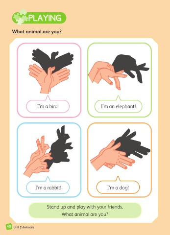 PLAYING PLAYING What animal are you? I’m a bird! I’m an elephant! I’m a rabbit! I’m a dog! Stand up and play with your friends. What animal are you? 40 Unit 2 Animals