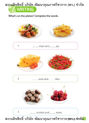 สงวนลิขสิทธิ์ บริษัท พัฒนาคุณภาพวิชาการ (พว.) จำากัด WRITING WRITING What’s on the plates? Complete the words. 1 icken and ips 2 eese and illies 3 ocolate and erries สงวนลิขสิทธิ์ บริษัท พัฒนาคุณภาพวิชาการ (พว.) จำากัด 35 Unit 2 It’s Lunchtime!
