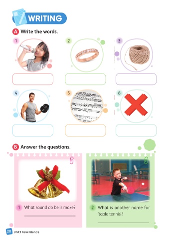 WRITING WRITING A Write the words. 1 2 3 4 5 6 B Answer the questions. 1 What sound do bells make? 2 What is another name for ‘table tennis’? 20 Unit 1 New Friends