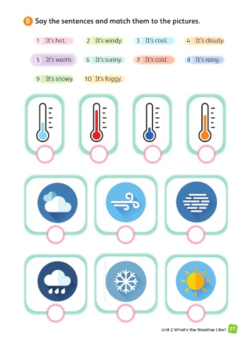 B Say the sentences and match them to the pictures. 1 It’s hot. 2 It’s windy. 3 It’s cool. 4 It’s cloudy. 5 It’s warm. 6 It’s sunny. 7 It’s cold. 8 It’s rainy. 9 It’s snowy. 10 It’s foggy. Unit 2 What’s the Weather Like? 27