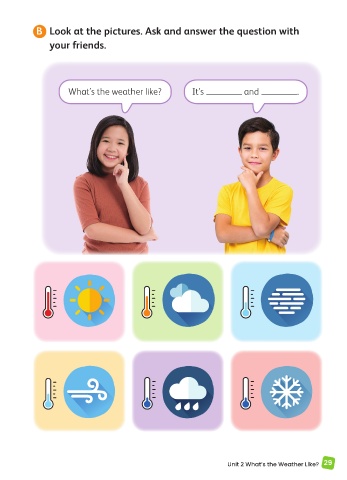B Look at the pictures. Ask and answer the question with your friends. What’s the weather like? It’s and . Unit 2 What’s the Weather Like? 29