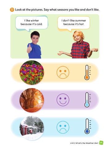 D Look at the pictures. Say what seasons you like and don’t like. I like winter I don’t like summer because it’s cold. because it’s hot. Unit 2 What’s the Weather Like? 35