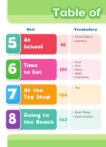 Table of Table of Table of Unit Vocabulary 5 At 86 School Subjects Adjectives School 6 Time 106 Food Time Places to Eat Meals Prepositions 7 At the 124 Toys Toy Shop 8 Going to 142 Beach Things Beach Activities the Beach