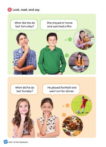 B Look, read, and say. What did she do She stayed at home last Saturday? and watched a film. What did he do He played football and last Sunday? went out for dinner. 14 Unit 1 At the Weekend