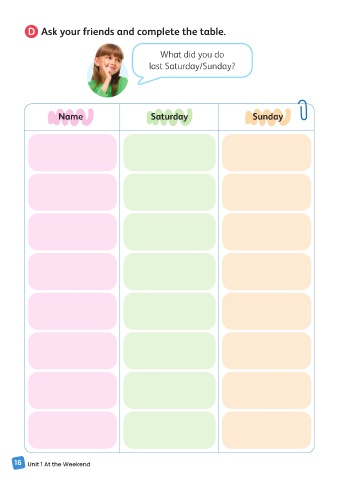 D Ask your friends and complete the table. What did you do last Saturday/Sunday? Name Saturday Sunday 16 Unit 1 At the Weekend