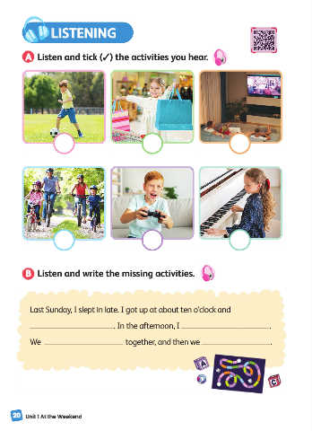 LISTENING LISTENING A Listen and tick (3) the activities you hear. B Listen and write the missing activities. Last Sunday, I slept in late. I got up at about ten o’clock and . In the afternoon, I . We together, and then we . 20 Unit 1 At the Weekend