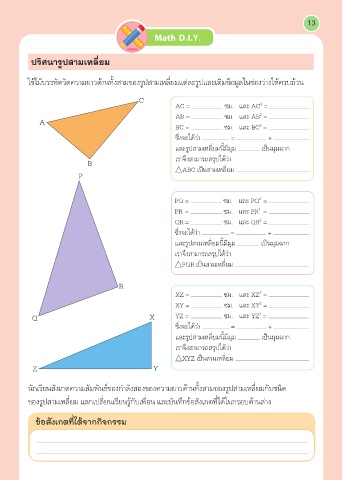 นักเรียนสังเกตความสัมพันธ์ของกำาลังสองของความยาวด้านทั้งสามของรูปสามเหลี่ยมกับชนิด