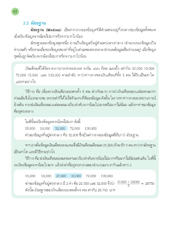 ค่าของข้อมูลที่อยู่ตรงกลาง คือ 32,000 ซึ่งเป็นค่ากลางของข้อมูลที่เรียกว่า มัธยฐาน