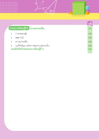 หน้ า หน้า ู ี หน่วยการเรียนร้ท่ 3 คว�มน่�จะเป็น 114 1. การทดลองสุ่ม 116 2. เหตุการณ์ 119 3. ความน่าจะเป็น 124 4. กฎที่สำาคัญบางประการของความน่าจะเป็น 134 แบบฝึกหัดท้�ยหน่วยก�รเรียนรู้ที่ 3 142
