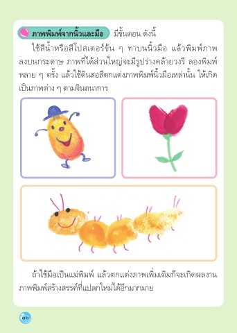 ใช้สีน้าหรือสีโปสเตอร์ข้น ๆ ทาบนนิ้วมือ แล้วพิมพ์ภาพ