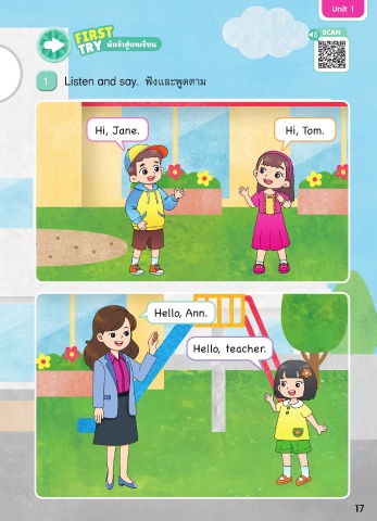 Unit 1 สงวนลิขสิทธิ์ บริษัท พัฒนาคุณภาพวิชาการ (พว.) จำากัด SCAN Hello Hello 1 Listen and say. ฟัังและพููดตาม Hi, Jane. Hi, Tom. Hello, Ann. Hello, teacher. สงวนลิขสิทธิ์ บริษัท พัฒนาคุณภาพวิชาการ (พว.) จำากัด 17