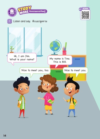 SCAN 1 Listen and say. ฟัังและพููดตาม Hi, I am Jim. What is your name? My name is Tina. This is Bill. Nice to meet you, too. Nice to meet you. 14