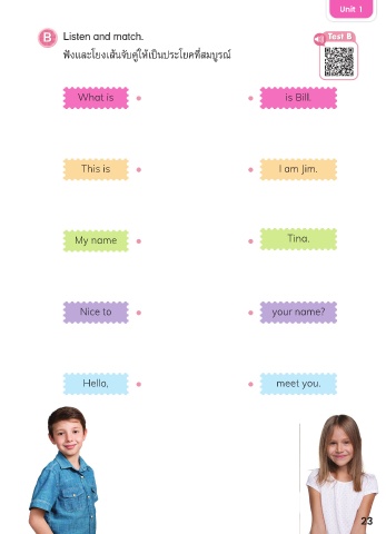 Unit 1 B Listen and match. Test B ู ฟัังและโยงเส้นจัับคู่�ให้้เป็็นป็ระโยคู่ที�สมบูรณ์์ What is is Bill. This is I am Jim. My name Tina. Nice to your name? Hello, meet you. 23