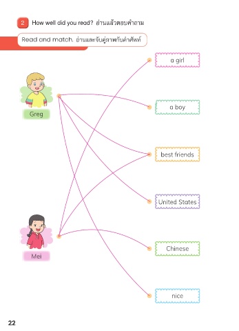 2 How well did you read? อ่�านแล้วตอ่บคู่ำาถาม ู่ Read and match. อ่านและจัับคู่ภาพกัับคู่ำศััพท์์ a girl a boy Greg best friends United States Chinese Mei nice 22