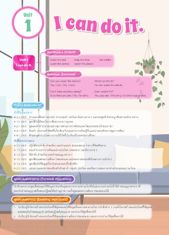 1. นักเรียนรู้จักโครงสร้างของประโยคที่ใช้พูดขอและให้ข้อมูลเรื่องความสามารถในการทำาสิ่งต่าง ๆ รวมทั้งโครงสร้างของประโยคที่ใช้พูดขอ