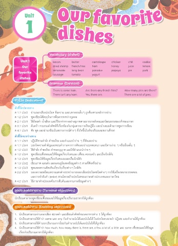 1. นักเรียนสามารถอ่านออกเสียง สะกดคำา และเขียนคำาศัพท์หมวดอาหารต่าง ๆ ได้ถูกต้อง