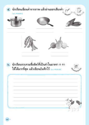 ี ี ํ ํ ่ ั ๕. นกเรยนเขยนคาจากภาพ แล้วอานออกเสียงคา (๑๐ คะแนน) เขียนคล่อง ใบงาน ๖. นักเรียนรวบรวมชื่อสัตว์ที่เป็นคําในมาตรา ก กา ให้ได้มากที่สุด แล้วเขียนบันทึกไว้ (๑๐ คะแนน) กิจกรรมบูรณาการ 14