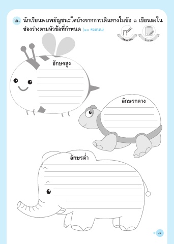 ๒. นักเรียนพบพยัญชนะใดบ้างจากการเดินทางในข้อ ๑ เขียนลงใน ช่องว่างตามหัวข้อที่กําหนด (๑๐ คะแนน) เขียนคล่อง ใบงาน อักษรสูง อักษรกลาง อักษรตํ่า 7