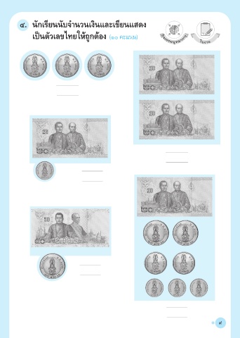 ๔. นักเรียนนับจํานวนเงินและเขียนแสดง เป็นตัวเลขไทยให้ถูกต้อง (๑๐ คะแนน) กิจกรรมบูรณาการ ใบงาน 9