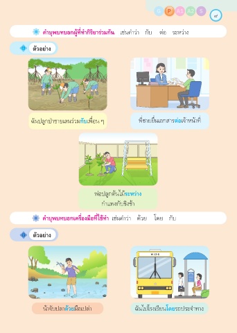 คำาบุพบทบอกผู้ที่ทากิริยาร่วมกัน เช่นคำาว่า กับ ต่อ ระหว่าง