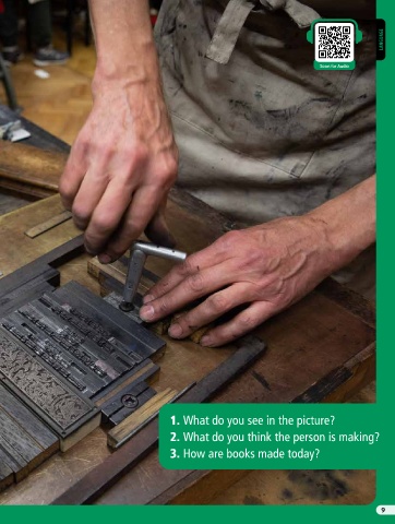 LANGUAGE Scan for Audio 1. What do you see in the picture? 2. What do you think the person is making? 3. How are books made today? 9