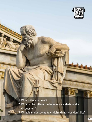 Scan for Audio SOCRA THE SOCRATIC THE TIC METHOD METHOD 1. Who is the statue of? 2. What is the difference between a debate and a discussion? 3. What is the best way to criticize things you don’t like? 8 9 9