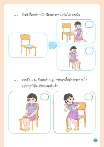 ๑.๒ ถ้าเก้าอี้สกปรก นักเรียนควรทำาอย่างไรก่อนนั่ง ๑.๓ จากข้อ ๑.๒ ถ้านักเรียนดูแลรักษาเสื้อผ้าขณะสวมใส่ อย่างถูกวิธีจะเกิดผลอย่างไร 23