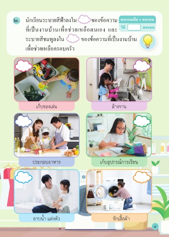 ๒. นักเรียนระบายสีฟ้าลงใน ของข้อความ คะแนนเต็ม ๖ คะแนน ี ท่เป็นงานบ้านเพื่อช่วยเหลือตนเอง และ ได้ คะแนน ระบายสีชมพูลงใน ของข้อความที่เป็นงานบ้าน เพื่อช่วยเหลือครอบครัว เก็บของเล่น ล้างจาน ประกอบอาหาร เก็บอุปกรณ์การเรียน อาบนํ้า แต่งตัว ซักเสื้อผ้า 7