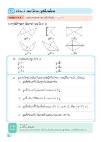 จุดประสงค์ 9.1 : บอกชนิดและสมบัติของรูปสี่เหลี่ยมได้ ( น. 44)