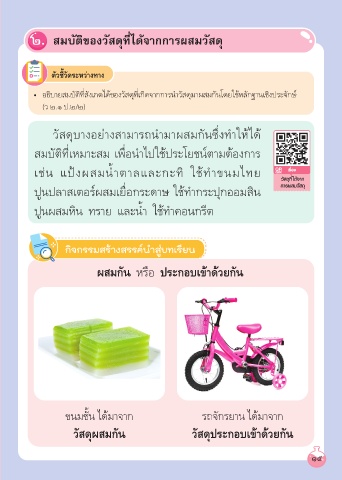 • อธิบายสมบัติที่สังเกตได้ของวัสดุที่เกิดจากการนําวัสดุมาผสมกันโดยใช้หลักฐานเชิงประจักษ์