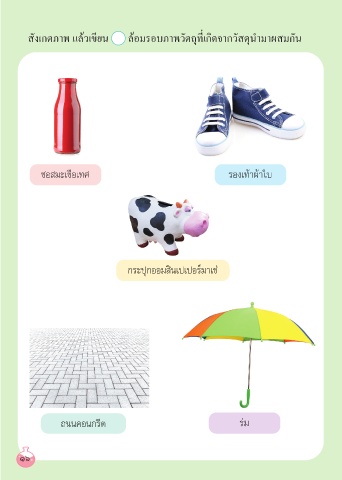 สังเกตภ�พ แล้วเขียน ล้อมรอบภ�พวัตถุที่เกิดจ�กวัสดุนำ�ม�ผสมกัน ซอสมะเขือเทศ รองเท้าผ้าใบ กระปุกออมสินเปเปอร์มาเช่ ถนนคอนกรีต ร่ม 16