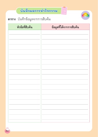 ำ รท � ำ จกรรม ิ �ก กผลก นท บ บันทึกผลก�รท�กิจกรรม ึ ั ตาราง บันทึกข้อมูลจากการสืบค้น หัวข้อที่สืบค้น ข้อมูลที่ได้จากการสืบค้น 54