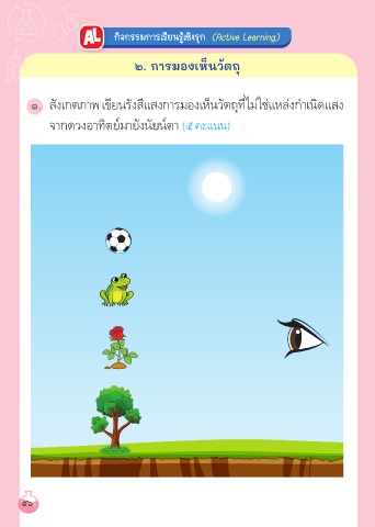 กิจกรรมการเรียนรู้เชิงรุก (Active Learning) ๒. การมองเห็นวัตถุ ี ๑. สังเกตภาพ เขียนรังสีแสงการมองเห็นวัตถุท่ไม่ใช่แหล่งกำาเนิดแสง จากดวงอาทิตย์มายังนัยน์ตา (๕ คะแนน) 56