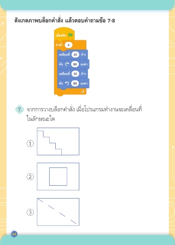 สังเกตภาพบล็อกคำาสั่ง แล้วตอบคำาถามข้อ 7-8 7. จากการวางบล็อกคำาสั่ง เมื่อโปรแกรมทำางานจะเคลื่อนที่ ในลักษณะใด 1 2 3 42