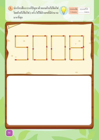 3. นักเรียนฝึกการแก้ปัญหาด้วยเกมย้ายไม้ขีดไฟ คะแนนเต็ม คะแนนที่ได้ ี ั ำ โดยย้ายไม้ขีดไฟ 2 คร้ง ให้ได้ตัวเลขท่มีจานวน 5 คะแนน คะแนน มากที่สุด 14