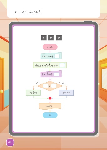 ตัวแปรที่กำาหนด มีดังนี้ H H B M H M M B B เริ่มต้น รับค่าความสูง คำานวณนำ้าหนักที่เหมาะสม รับค่านำ้าหนัก จริง ไม่จริง > คุณอ้วน คุณผอม แสดงผล จบ 44