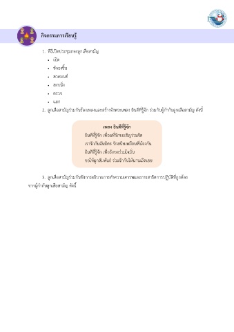 2. ลูกเสือสามัญร่วมกันร้องเพลงและสร้างจังหวะเพลง ยินดีที่รู้จัก ร่วมกับผู้กำกับลูกเสือสามัญ ดังนี้