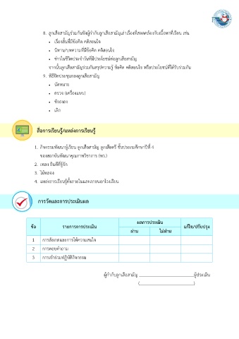 8. ลูกเสือสามัญร่วมกันฟังผู้กำกับลูกเสือสามัญเล่าเรื่องที่สอดคล้องกับเนื้อหาที่เรียน เช่น