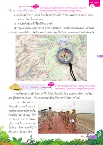 ลูกเสือต้องตั้งทิศทางแผนที่ด้วยเข็มทิศ พึงจำาไว้ว่าด้านบนแผนที่คือทิศเหนือเสมอ
