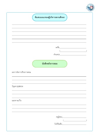 ข้อเสนอแนะของผู้บริหารสถานศึกษา ลงชื่อ ( ) ตำแหน่ง บันทึกหลังการสอน ผลการจัดการเรียนการสอน ปัญหา/อุปสรรค แนวทางแก้ไข ครูผู้สอน ( ) วันที่บันทึก