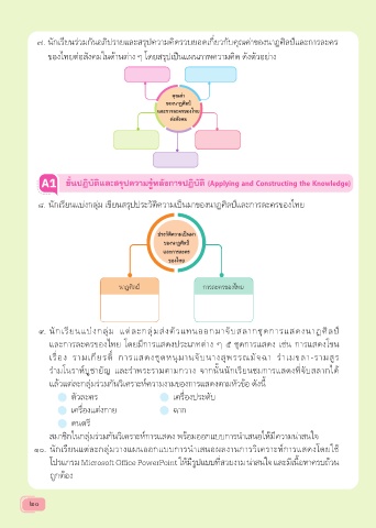 ๘. นักเรียนแบ่งกลุ่ม เขียนสรุปประวัติความเป็นมาของนาฏศิลป์และการละครของไทย