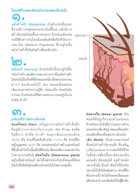 เส้นขน คือ ส่วนที่โผล่พ้นผิวหนัง รากขน คือ ส่วนที่ฝัง เล็บ (Nails) เป็นส่วนของเซลล์
